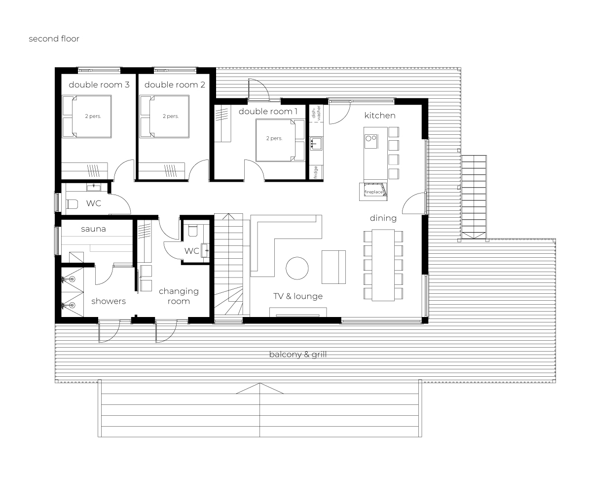 The modern chalet offers everything you need — from cozy, private bedrooms and spacious shared living areas to a fully equipped kitchen, a large sauna, and a dedicated ski room.