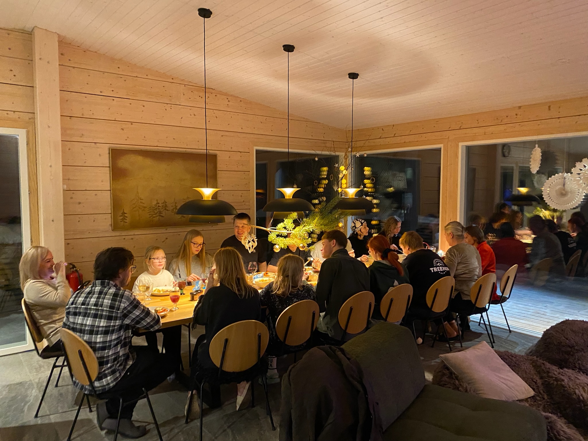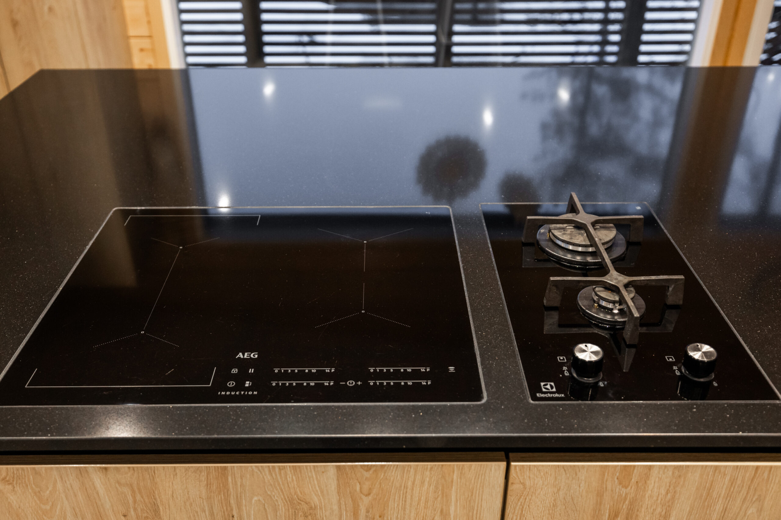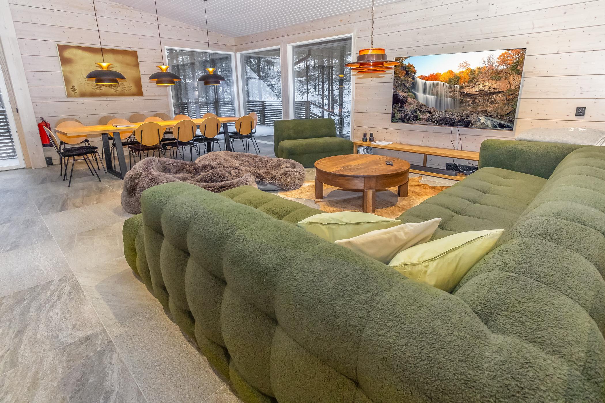 The spacious dining and living area is designed for both comfort and togetherness. A large dining table is perfect for group catering and shared meals.