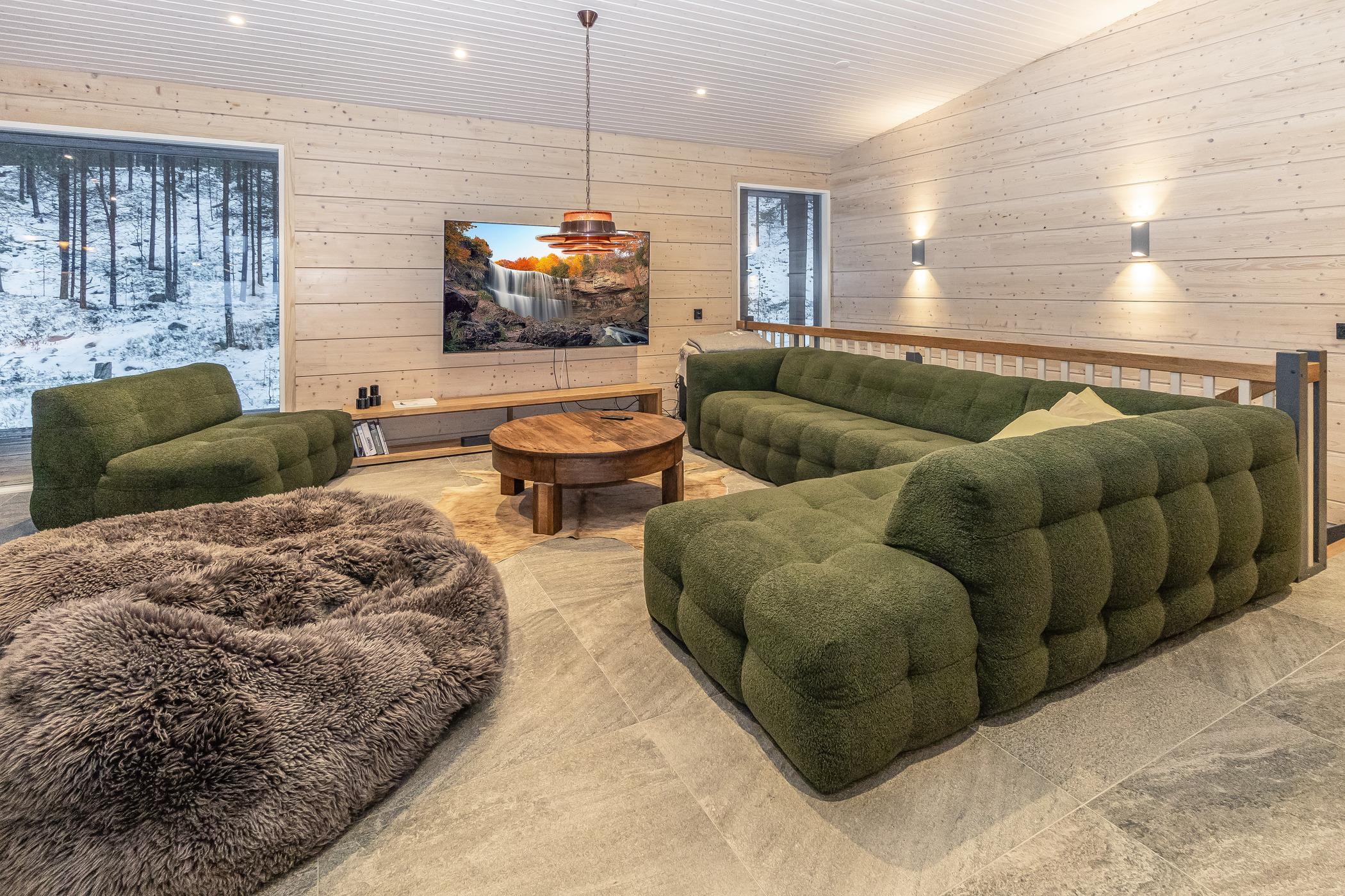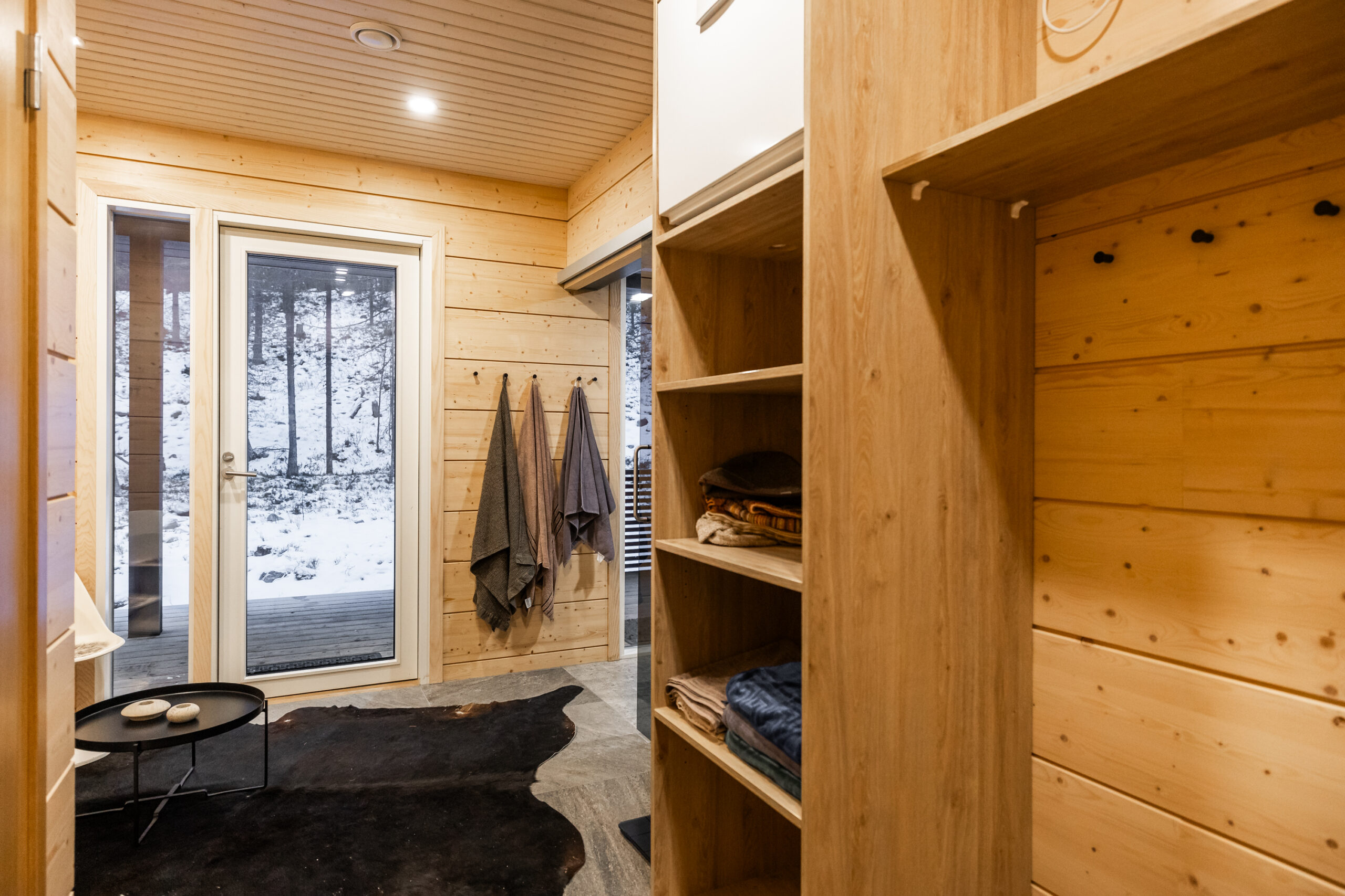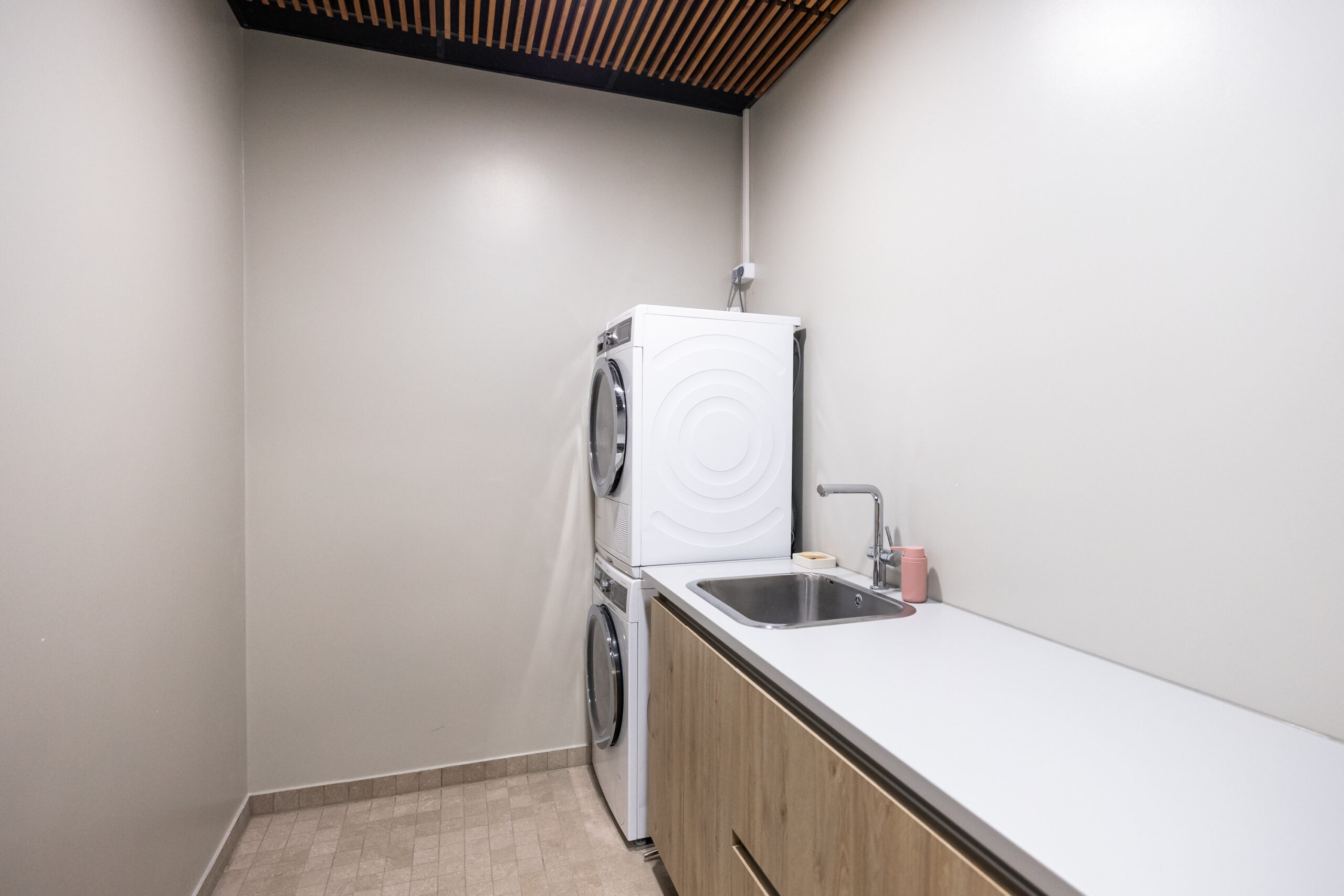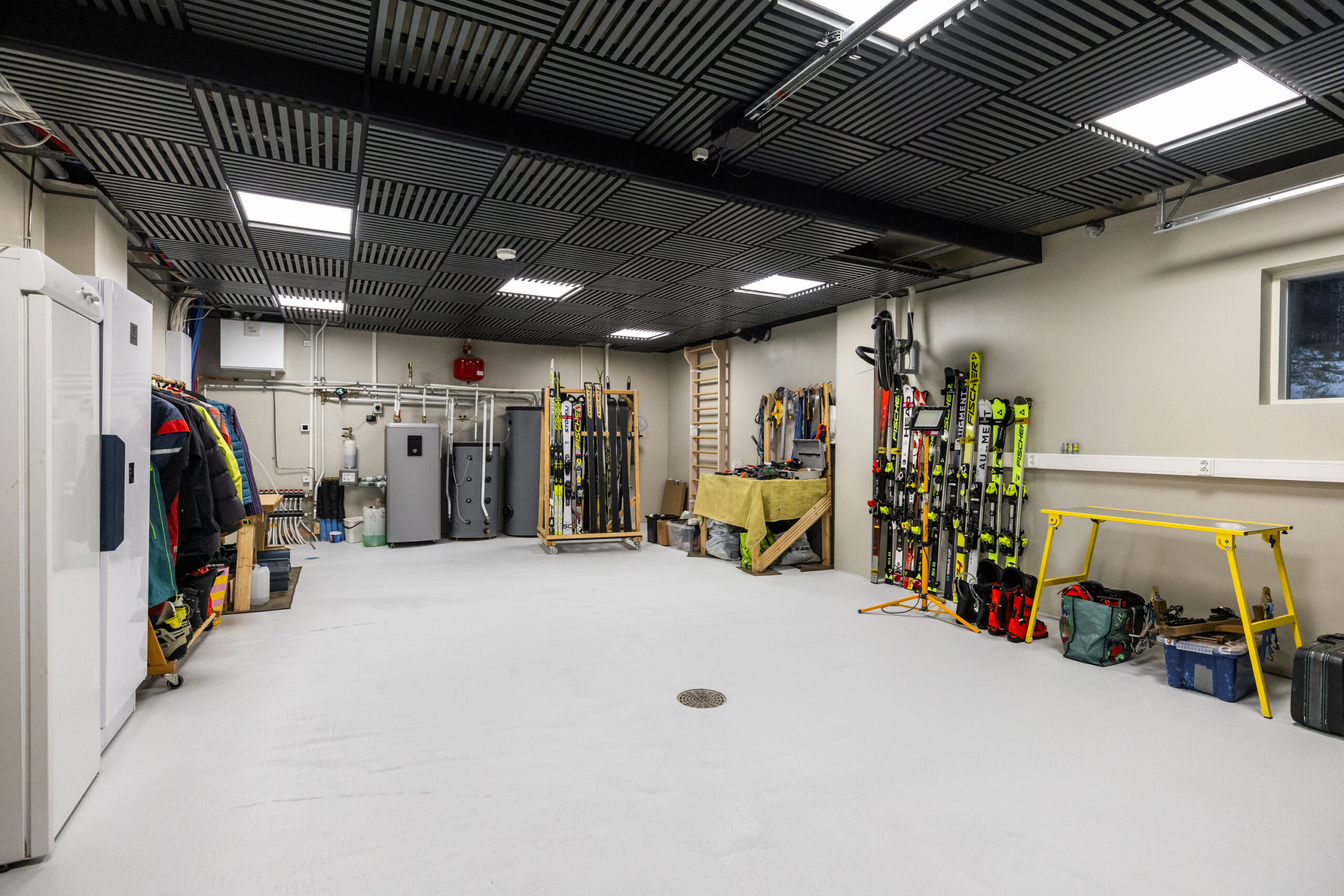 The spacious ski and storage room on the ground floor features a drying cabinet for outdoor gear and a large refrigerator for added convenience. There is also a dedicated utility room with a washing machine and dryer.