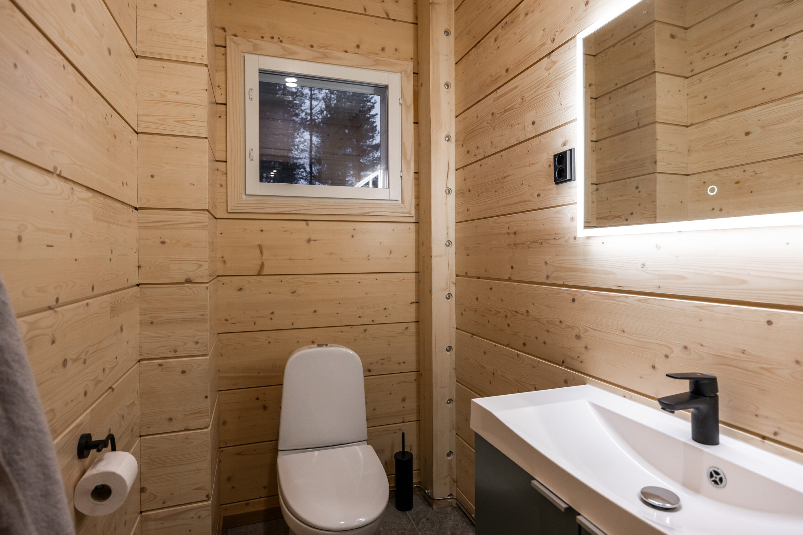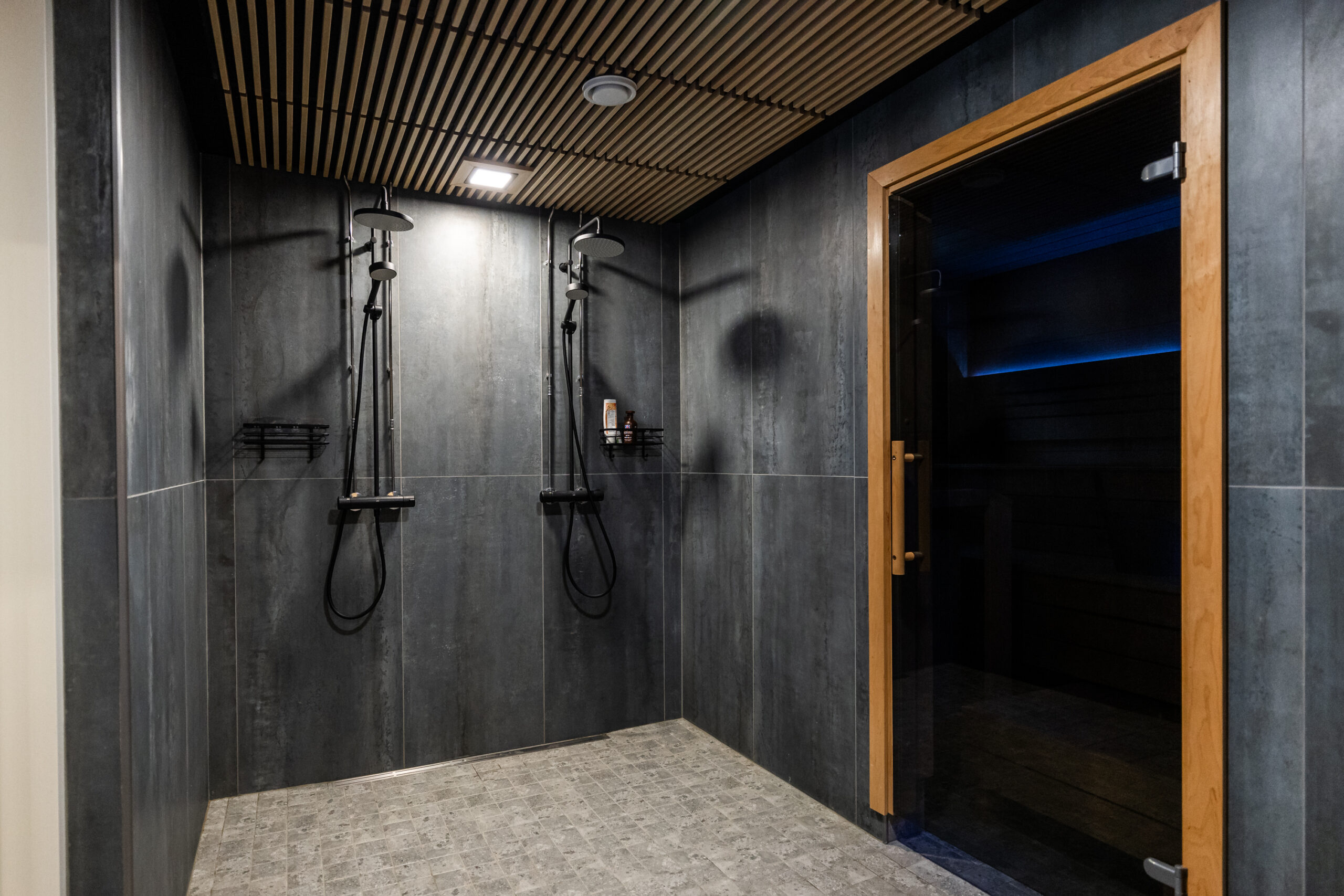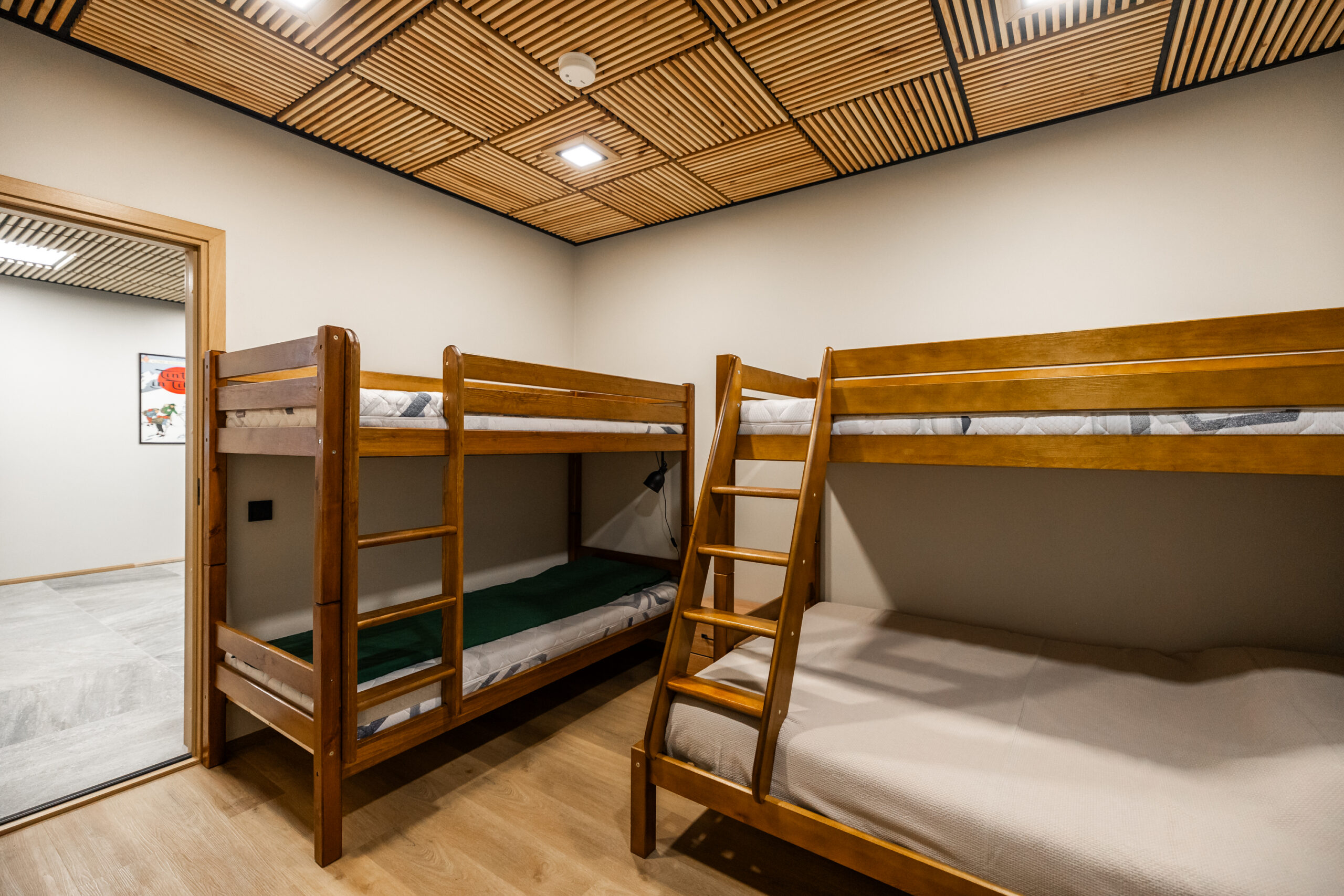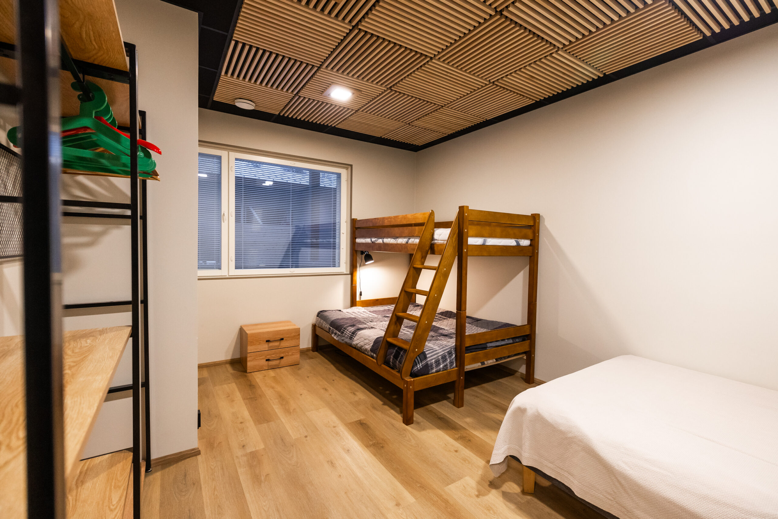 The spacious ski and storage room on the ground floor features a drying cabinet for outdoor gear and a large refrigerator for added convenience. There is also a dedicated utility room with a washing machine and dryer.