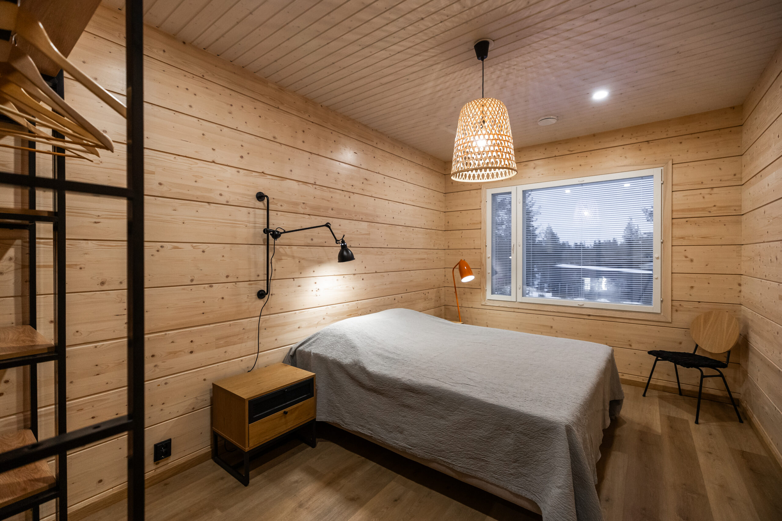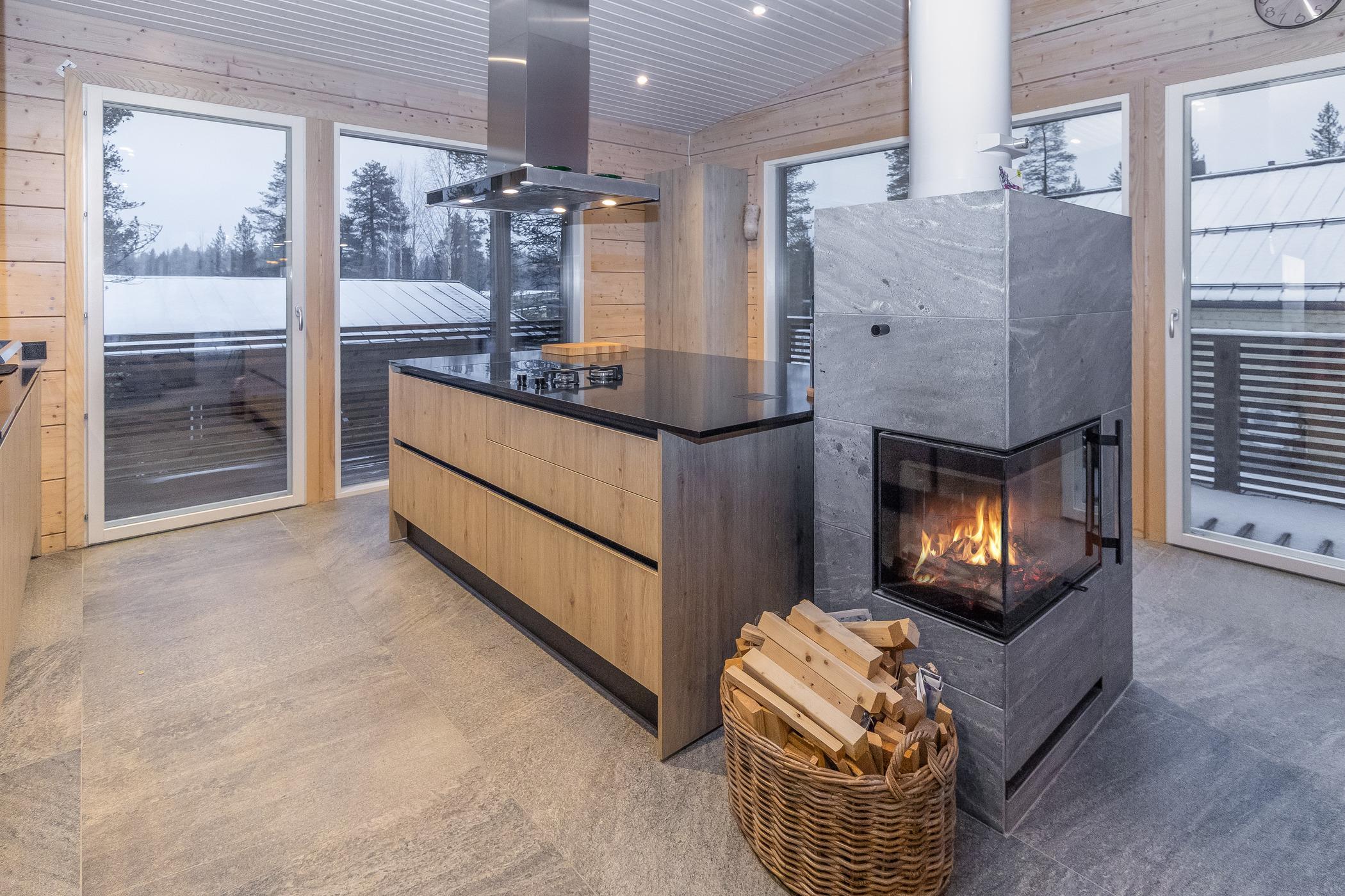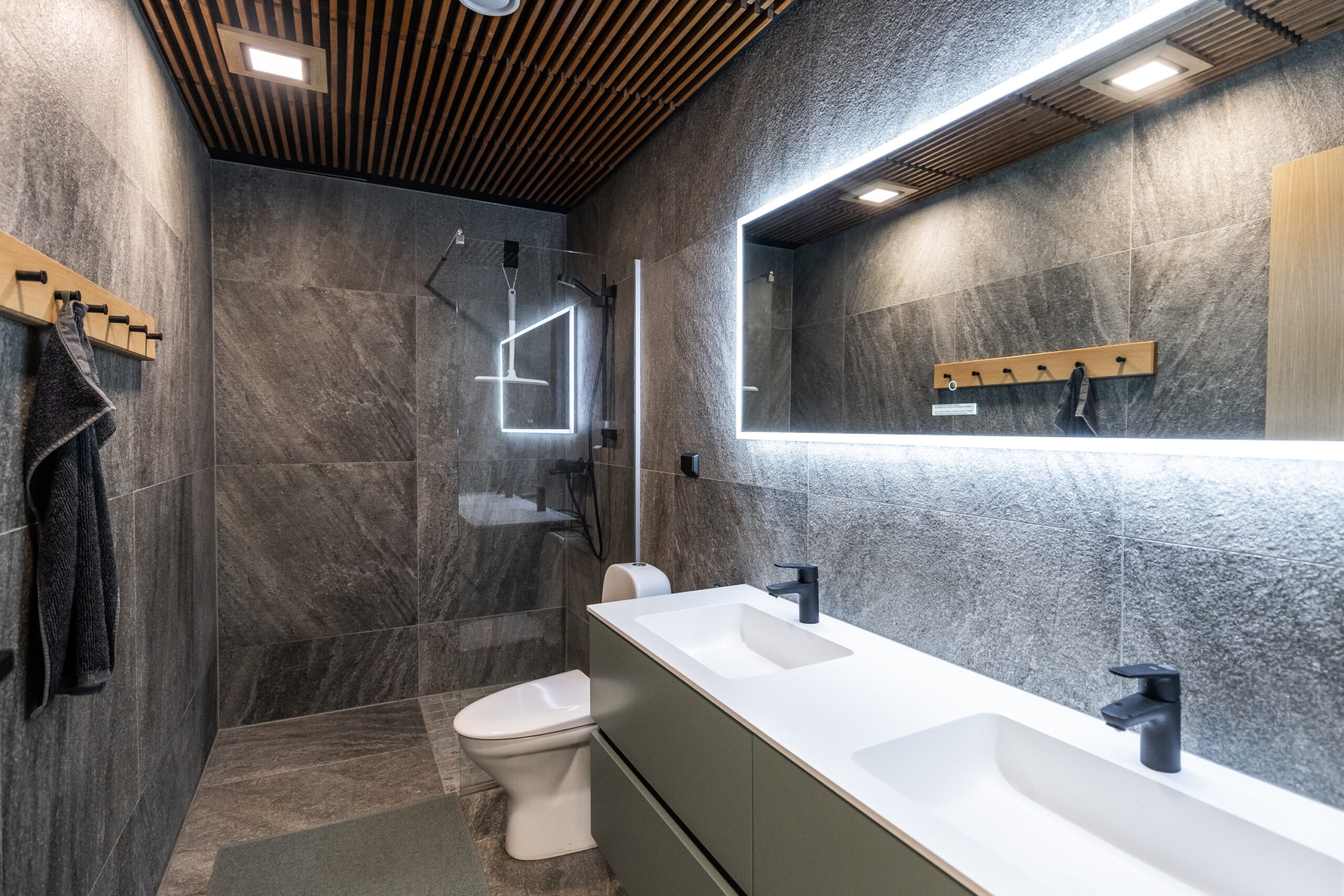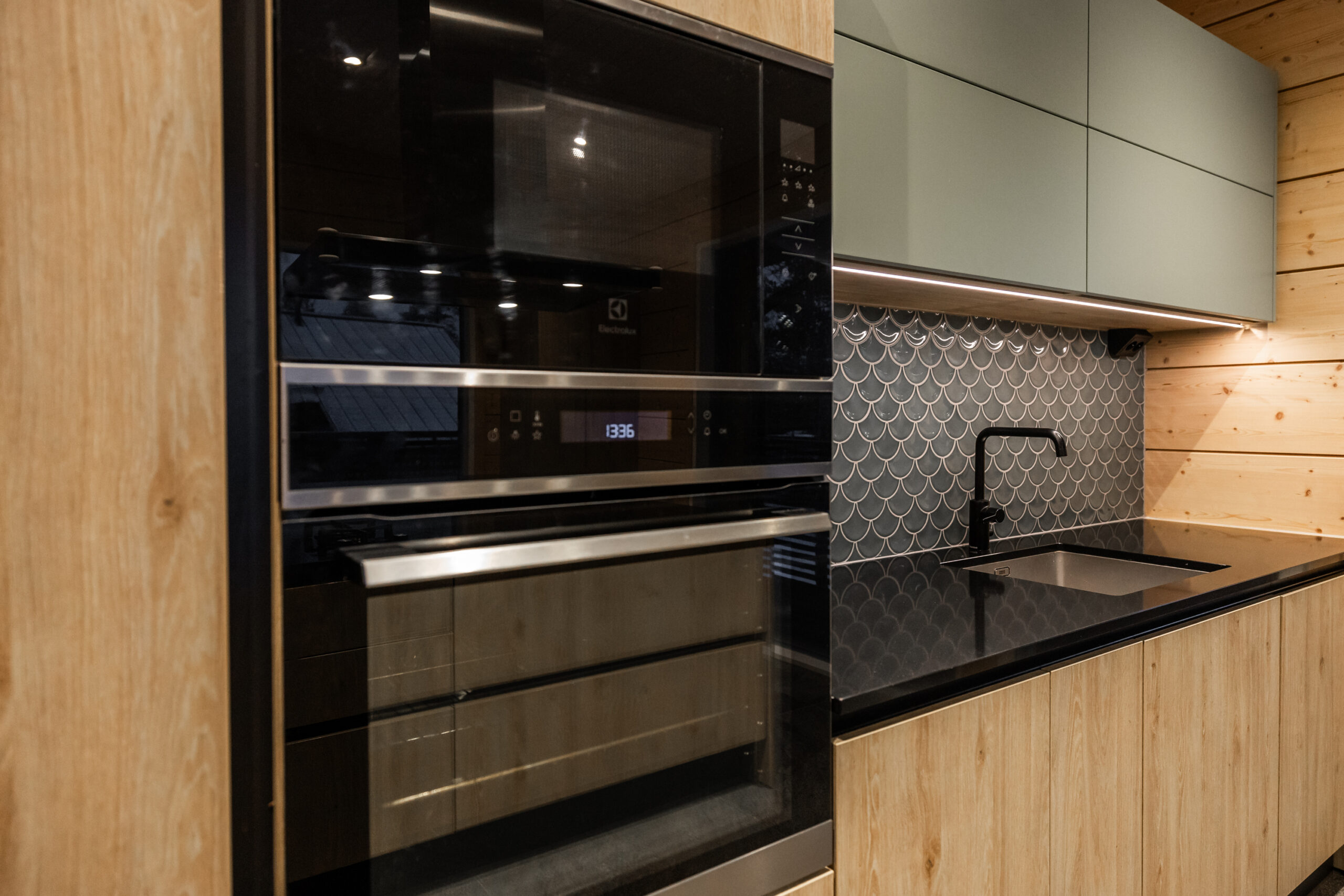 The spacious ski and storage room on the ground floor features a drying cabinet for outdoor gear and a large refrigerator for added convenience. There is also a dedicated utility room with a washing machine and dryer.