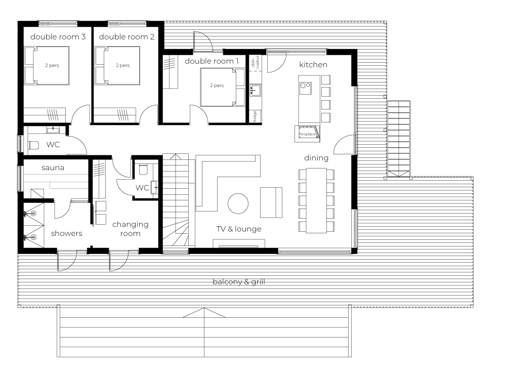 The cabin comfortably accommodates up to 16 guests, making it an excellent choice not only for families and friends, but also for sports teams, training camps, and competition stays.